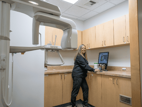 This specialized digital x-ray captures a complete view of your entire mouth, jaw, and surrounding structures in one comfortable scan. Taking just seconds to complete, panoramic x-rays help us evaluate wisdom teeth, plan implant placement, diagnose TMJ issues, and assess overall oral health during comprehensive exams. You simply stand still while the machine rotates around your head—no uncomfortable bite pieces required. This technology gives us a complete picture for better treatment planning.